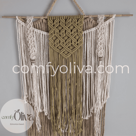 The Olive Tapestry Macrame Wall Hanging is a handcrafted statement piece, expertly blending rich olive green with layered neutrals in intricate knotwork and flowing fringe. Measuring 30 inches in length by 24 inches in width, this Edmonton-designed fibre art adds warmth, texture, and natural elegance to modern Alberta homes—perfect for bedrooms, living rooms, or entryways.